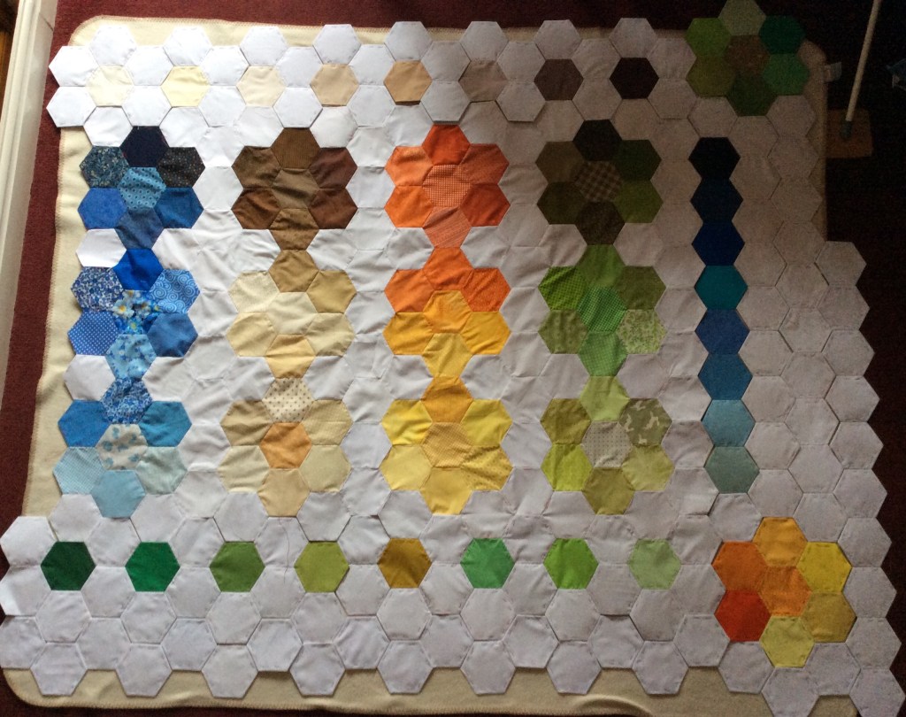 So this edging will go along the side of the quilt at the top of the previous photo, and then just need to finish one for the opposite end. The side (to the right of the previous photo) just needs 8 half hexagons added to its border and then it will be complete. Therefore, I may do a small happy dance as the top part of the quilt will be finished.