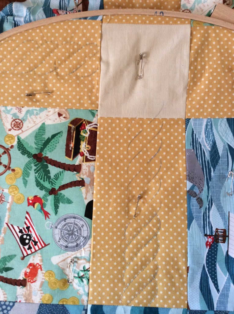 If you have read any previous posts this week you will be aware that I have had a week off work. During that time I have been fairly successful with sewing various pieces, including some more of my hand quilting on the pirate quilt. I have completed one section of the rope design and started on another section.