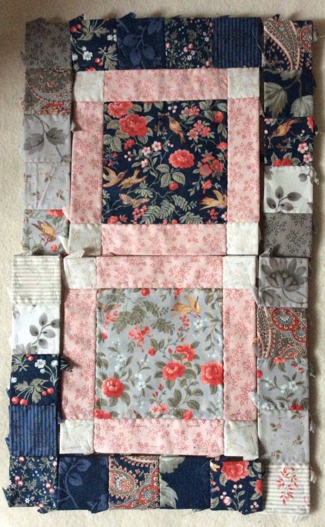 The new project is Daybreak and I purchased a jelly roll and a 5″ charm pack of the same name by 3 Sisters at Moda Fabrics. Here are some pictures, there are 2 blocks of 15″ x 9″ and a centre piece which finishes at 9″ square. The other squares (all 1 1/2″) are not complete yet and I have not designed how the blocks will look. It is a work in progress and since taking the photos I have completed the dark block. At the moment the quilt will finish at 39″ x 24″ without a border but knowing me I will change my mind.