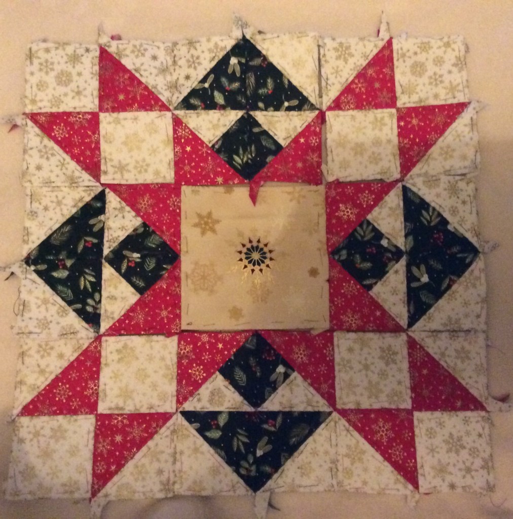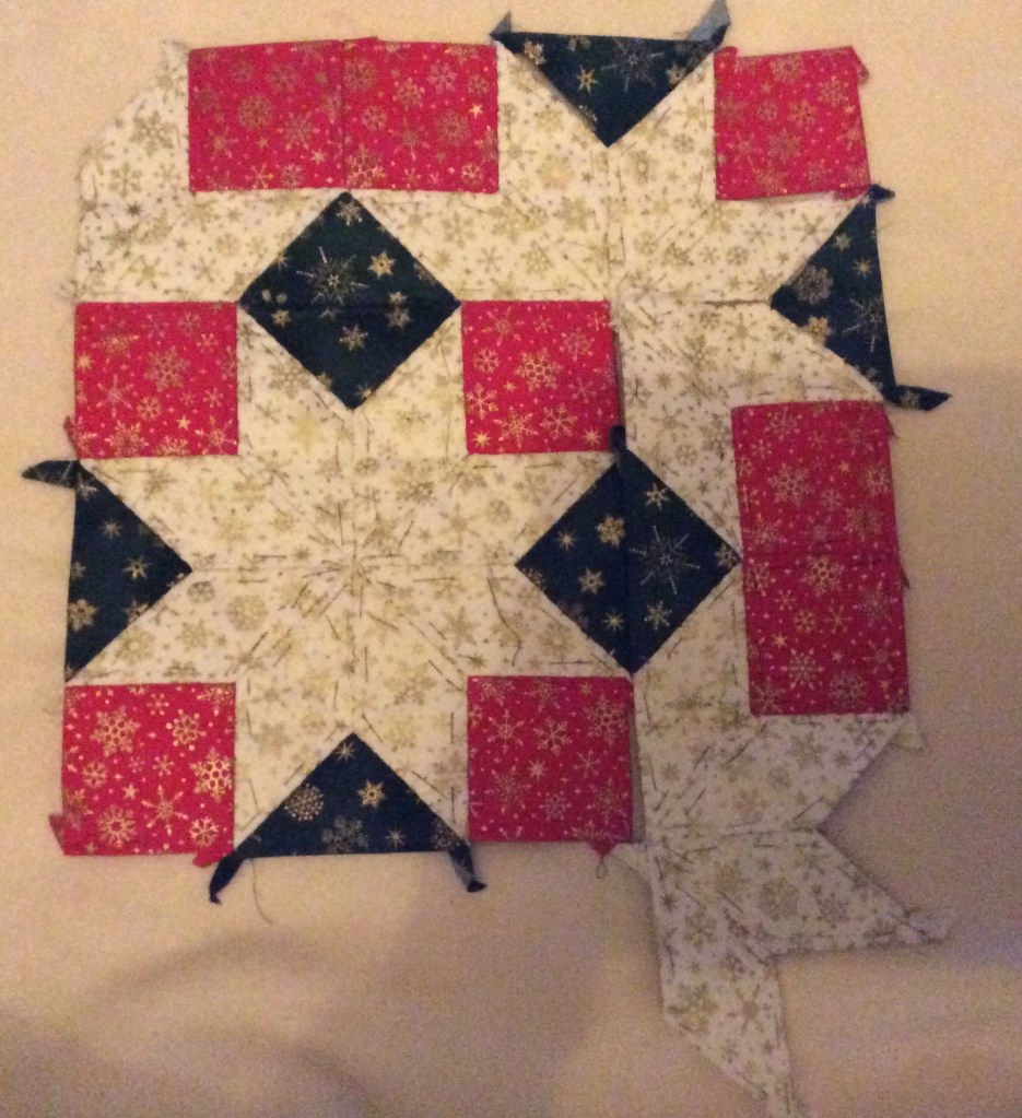 I have been sewing diligently on a Christmas Quilt idea (not for this year) and have made some good progress. The design is loosely based on a copy of Joyeux Noel in Todays Quilter Issue 68 by Amanda Little of Little Quilt House.