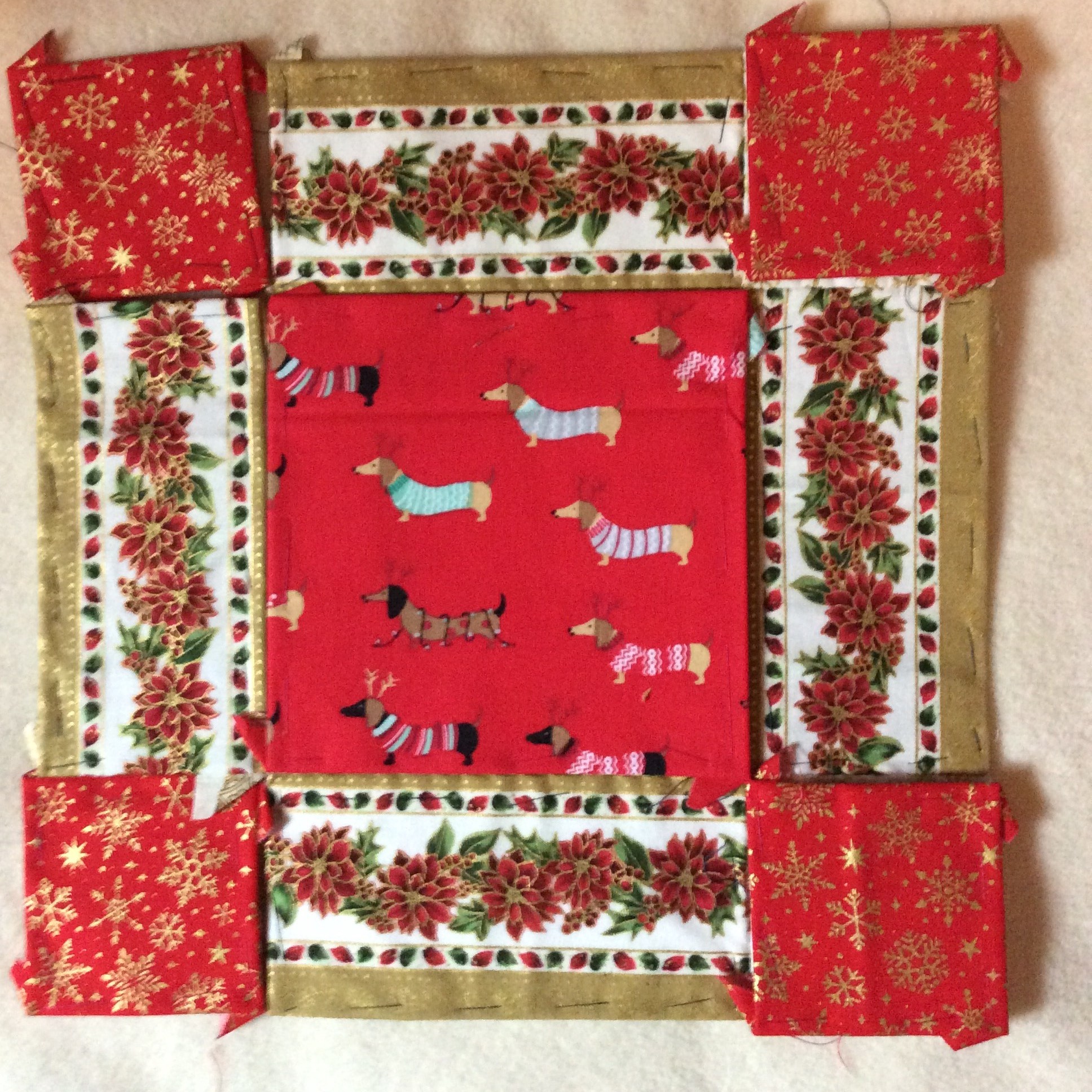 The green one at the top is completed but the red one is half sewn. The white sausage dog print block is two thirds complete and I super-imposed the red sausage dog and red corners on top of the white print to see how it looked.