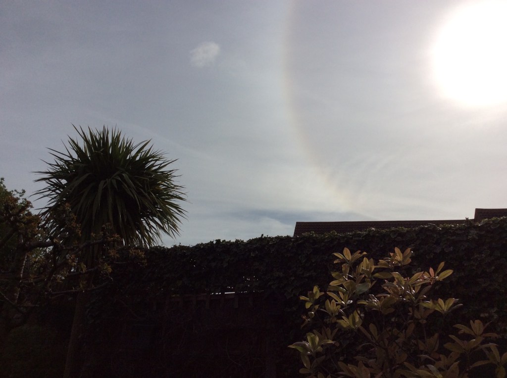 Hope you have all enjoyed the Easter Holidays. The weather in my part of old Blighty has been most enjoyable. Small jobs have got done in the garden, today I was on pond cleaning duties which is quite smelly as the water had gone very green and it reminded me of a seaweed estuary. It was very satisfying when completed. Birds do not seem to mind the horrible water and we had one frog which I rescued and he hopped away – hope he comes back. Anyway at 9:30 this morning I took the following photograph and there was a bright rainbow halo to the sun – does this have a special name?