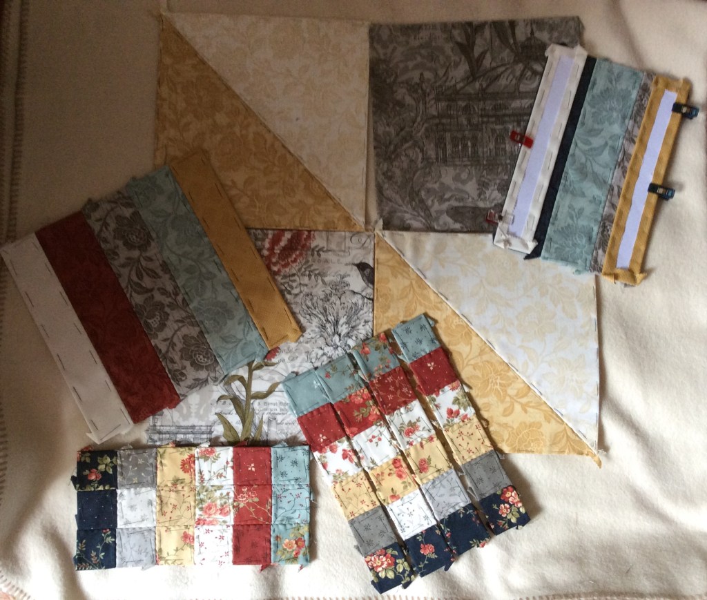 I have also been sewing various blocks of “Memoirs” quilt. Here are some photos – this is not the layout just a scattering of the blocks.