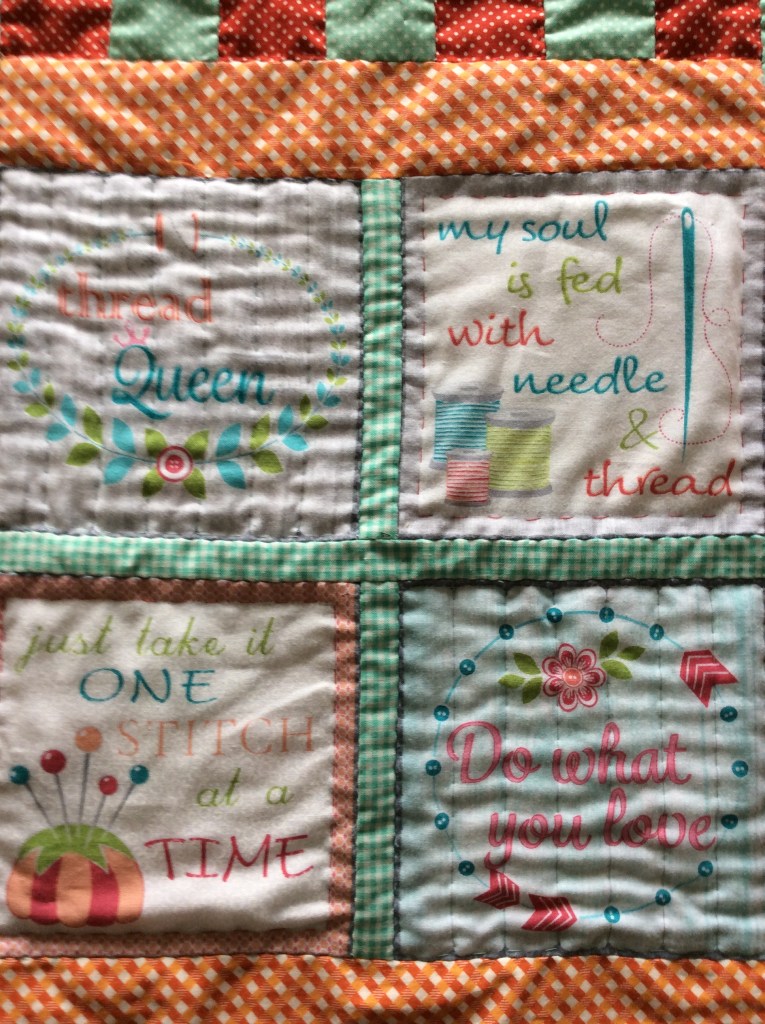 The other item which has taken up my time is the table coverlet about Sewing. I have been quilting the centre using the spaced lines on the material image and sewed around all the red 1 1/2″ squares (there is that size again). I also intend to sew the outside border in a rib design. I haven’t put any quilting in the orange gingham as it looks too busy.