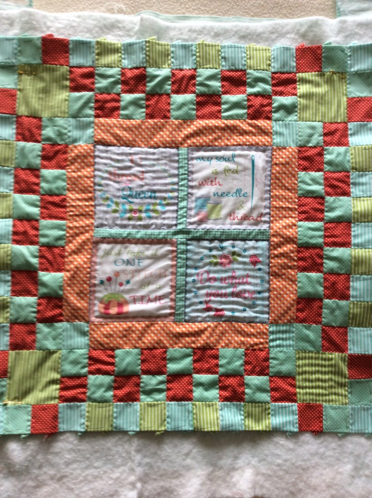 Also been working on my “Memoirs” quilt which I am thoroughly enjoying. Again it is made in the majority with 1 1/2″ squares and a layer cake. And I had just arranged the below layout when the doorbell chimed and the fabric I ordered for the border with the quotation and the backing fabric arrived. Perfect!