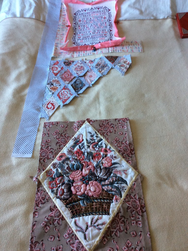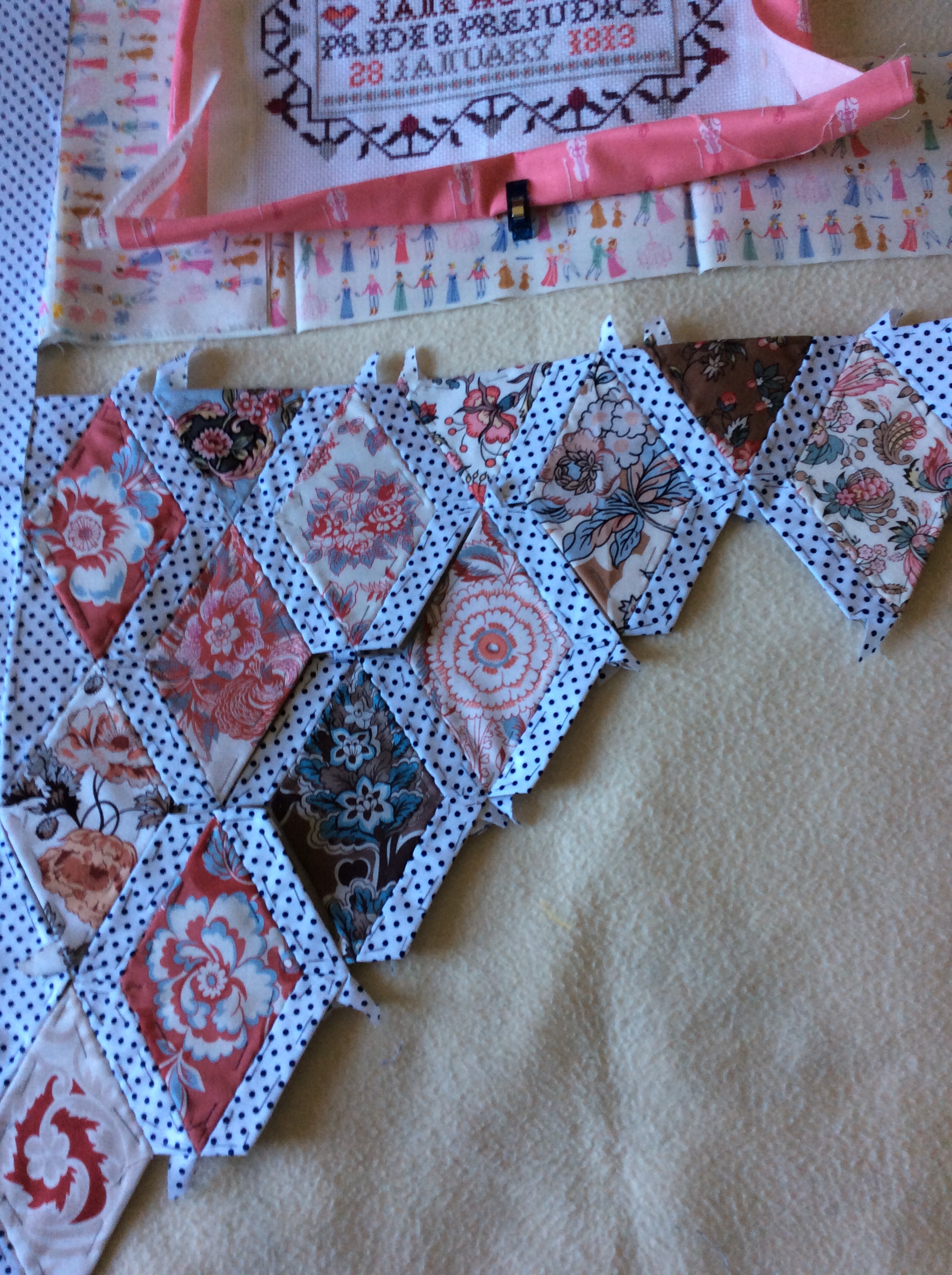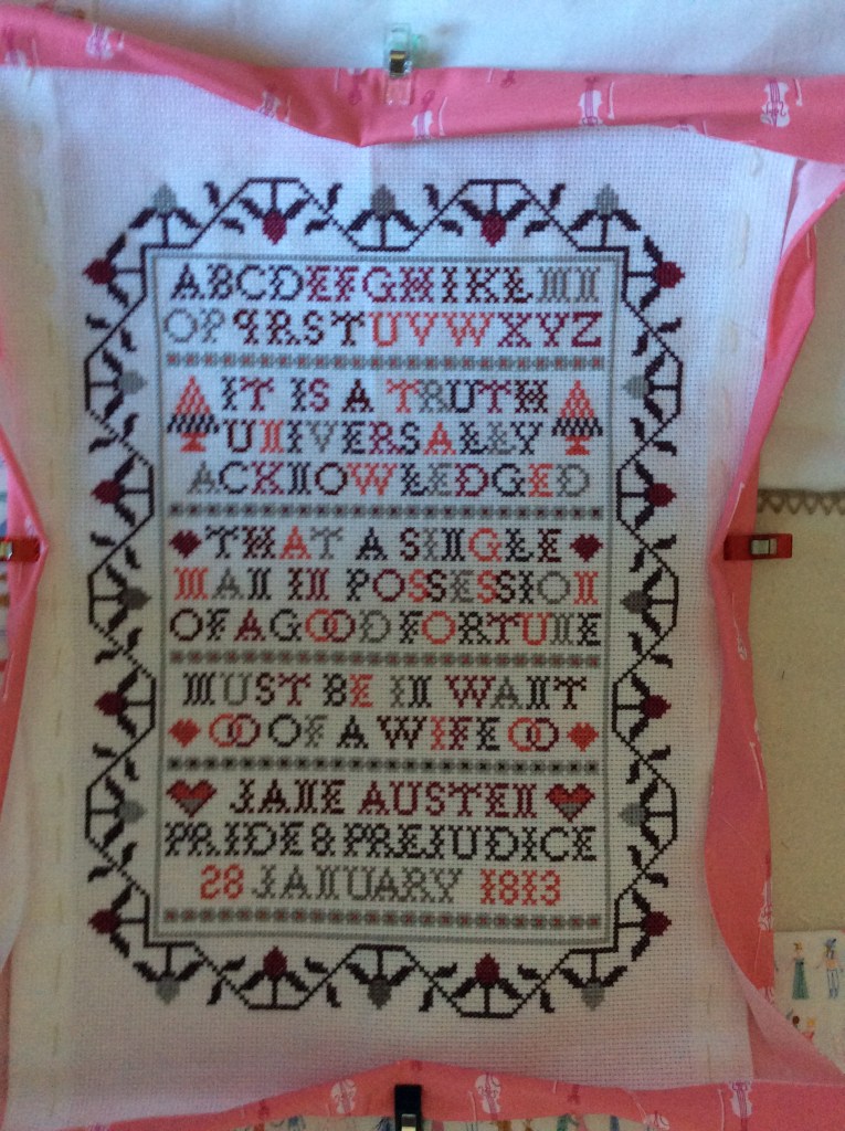 The new start is my “Pemberley Quilt” which is a mix of cross stitch, a quilted panel, and a re-hash of the original Jane Austen Panel. It will also incorporate some material from the range by Riley Blake Designs called “Pemberley” by citrus and mint designs. Here are a few photos of my basic design at the moment (you know me it will probably change).
