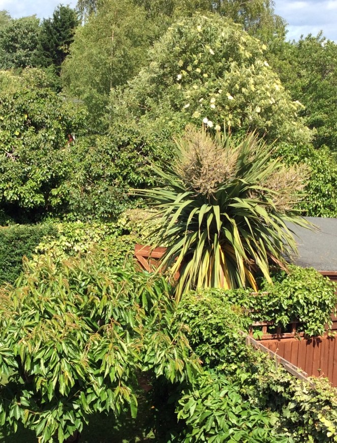 After the hard snowbound winter that we endured, it has been time to tidy and sort out the garden. As I have mentioned before we have a few losses in the garden – primarily the palm tree. (I will show you some old pictures of the palm tree in its prime.) We have now sawn down the tree leaving a stump which my husband has now nailed the ornamental crow/jackdaw to. And we had decided to leave a small part of the garden to become naturized by planting wild flowers in front of the shed.