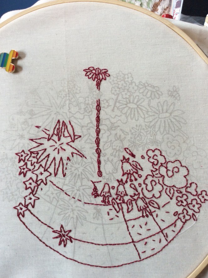Well on the sewing front I have pushed on with the Redwork Basket Quilt designed by Mandy Shaw of Dandelion Designs. I have sewn the first three rows together so half the quilt is finished. (No Photo). I have also stitched quite a bit on the August Basket.