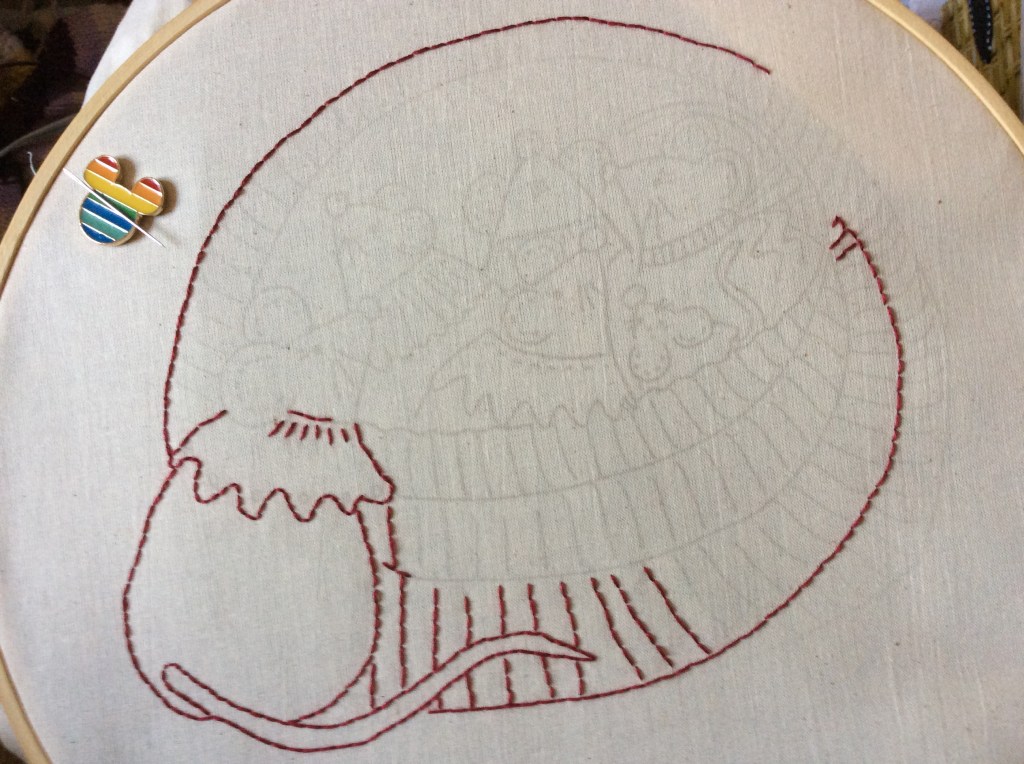 This is the November Block. One more Block and then I can iron/press and block all sewing and start the long job of stitching the whole quilt together. I am still in love with this quilt. For those who are new to my site it is a quilt design by Mandy Shaw from Dandelion Designs and is called “The Redwork Basket Quilt”.