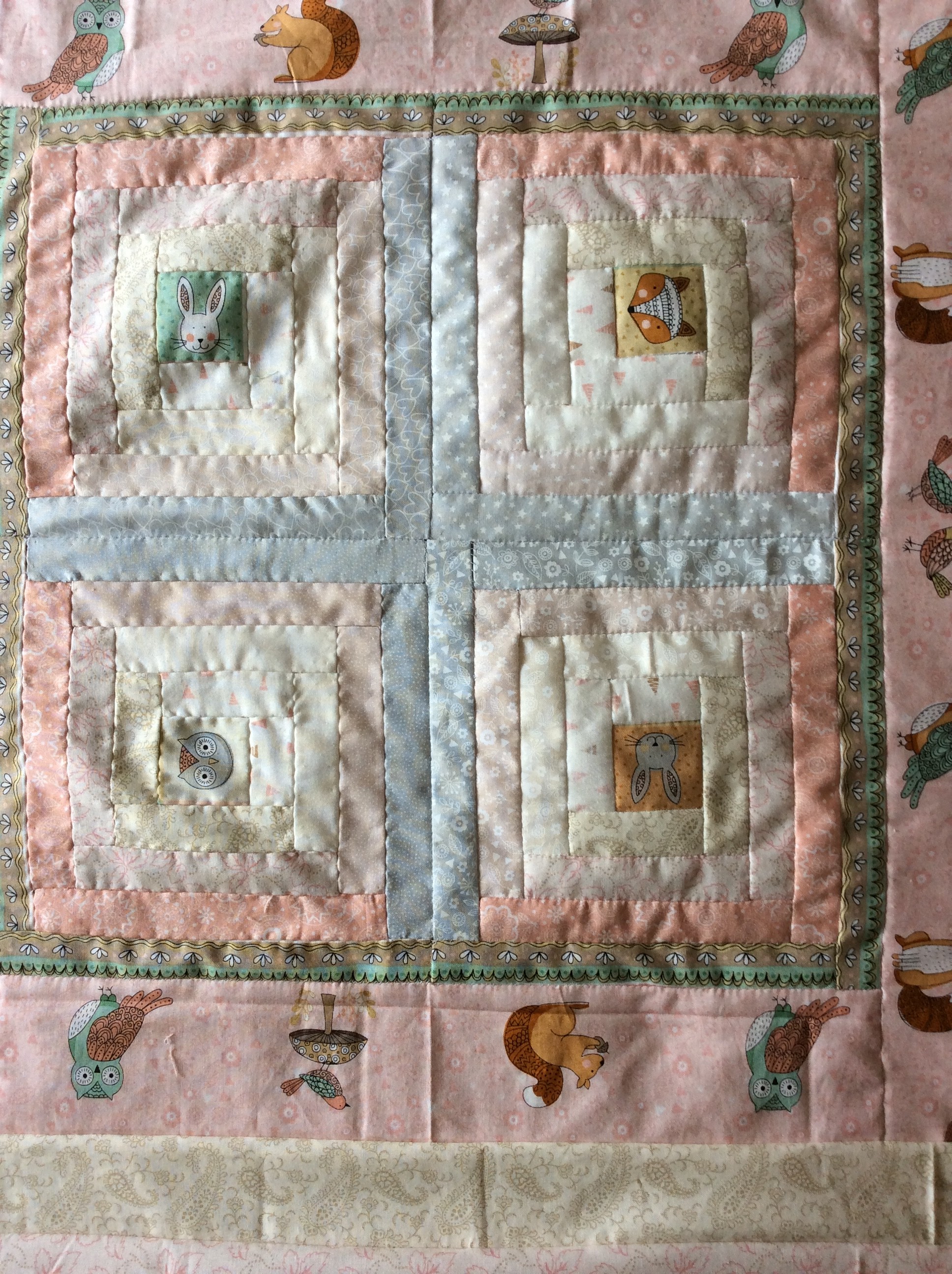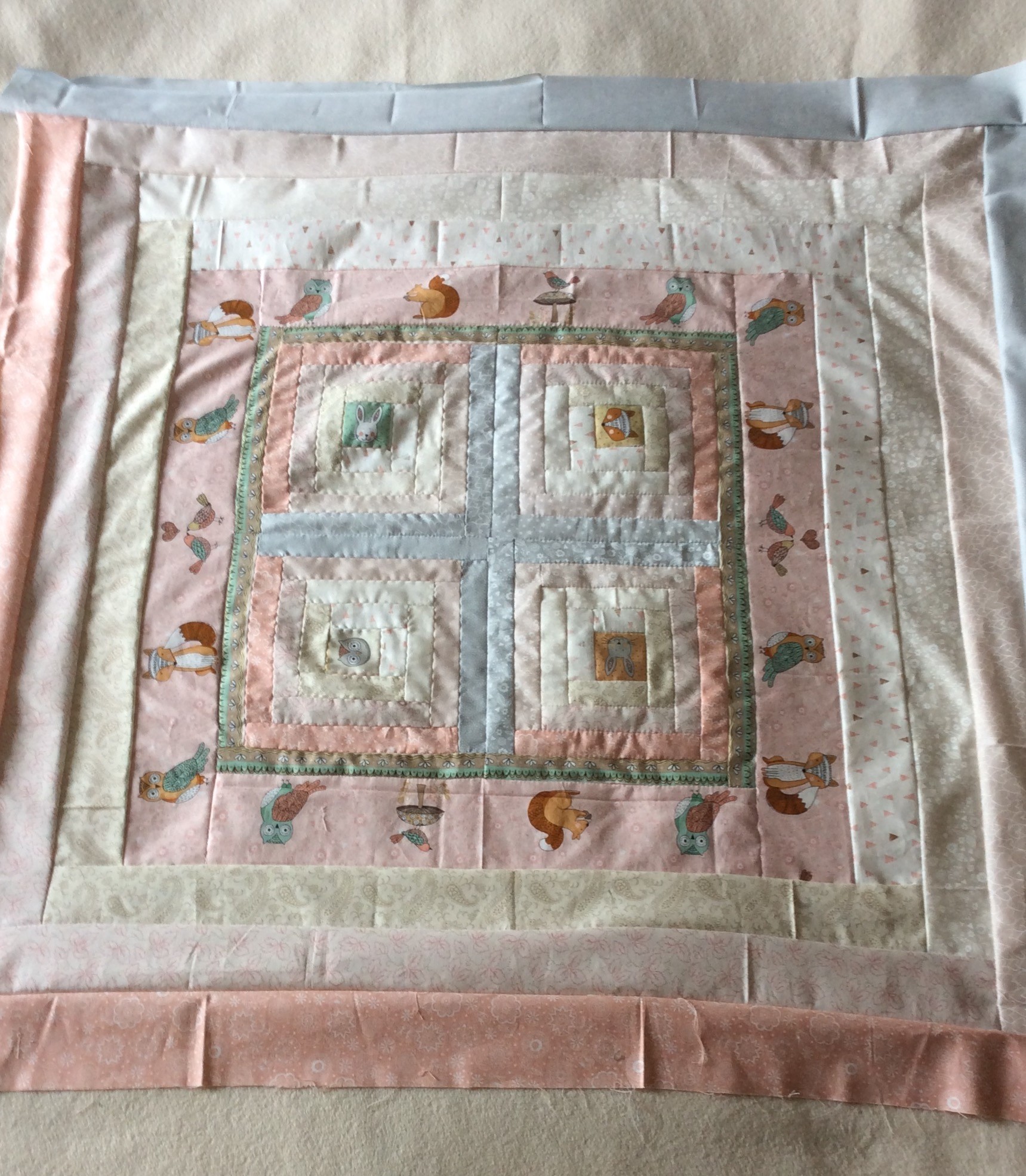 I should be working on, let me check the list for April’s selection ahh! Finish the Bag, Blanket and Book Sleeve Trio. Well not a stitch has flown that way. Instead I put the binding on the Mowgli Quilt which was on the list and then diverted my attention to this quilt = The Log Cabin Small Animals Quilt. It’s not my fault it just called to me. Well it is done now I have the backing and just need to choose how I am going to bind it.