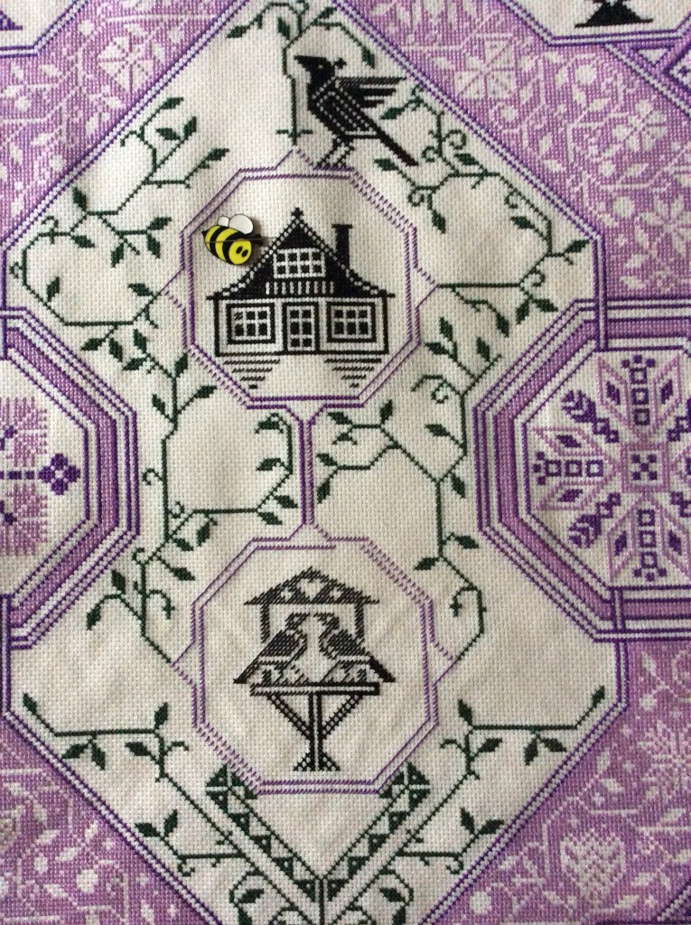 There is still loads to do – my initials, squirrels and more birds in black and berries in lilac and overstitch the main outline in the centre and all around the outside edge of the design. It is quite a large design. but for now I am very happy with my progress.