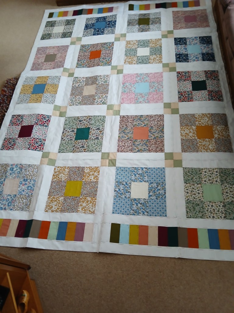 Firstly and bit of a happy dance I have finished the quilt top for my Liberty Quilt. It did not come about with out some trauma. Here is a photo taken on my phone at my mothers house (mainly as I don’t have somewhere large enough to lay it out flat). Spot the obvious problem. (Yes one sashing row is up the wrong way.) Now a lot of sewing had been inputted in getting this far, nevertheless I gently cut the offending sashing blocks out(just the coloured ones), turned them around and resewed the line.