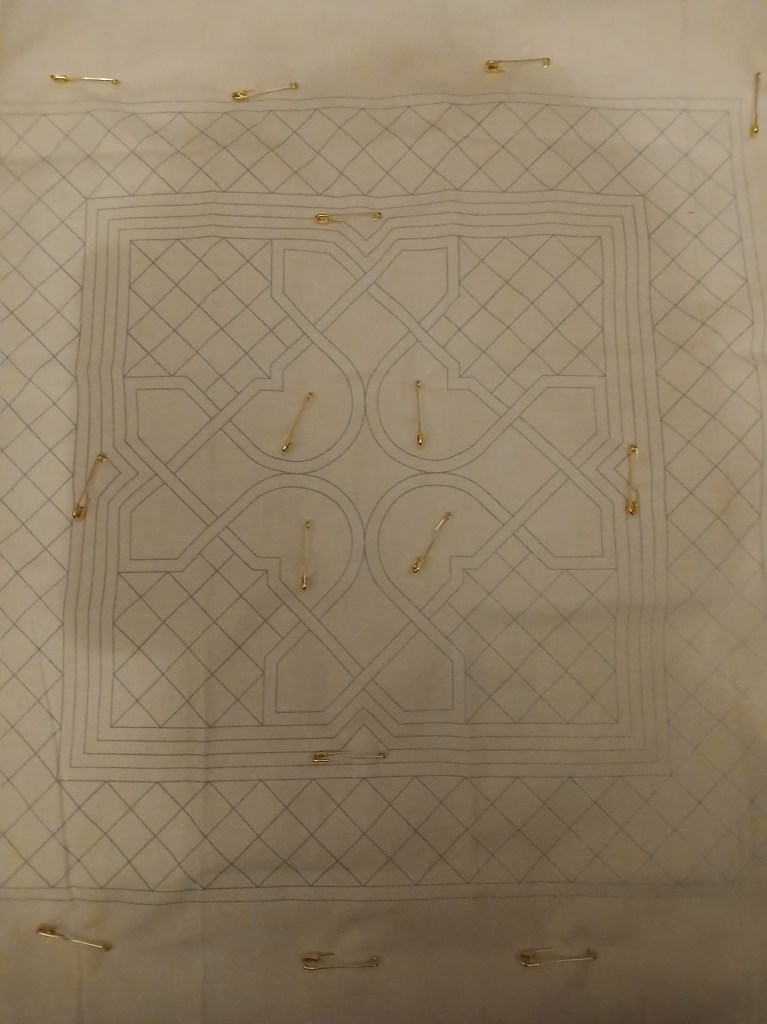 I am going to start a small project a mini wholecloth quilt. Its a Celtic Miniature and I am thinking if two colours – yellow for the main centre and frame and blue for the crosshatch design.